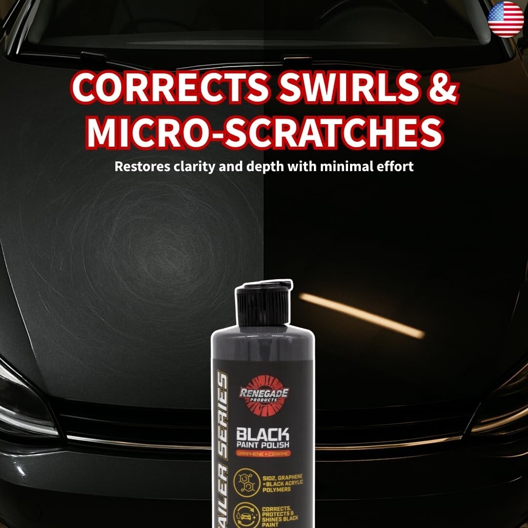 Bring out deep gloss and rich color on black vehicles with Renegade Products Graphene + Ceramic Black Paint Polish. This advanced formula combines graphene technology with SiO2 ceramic protection to enhance shine, improve paint clarity, and add a long-lasting protective layer.